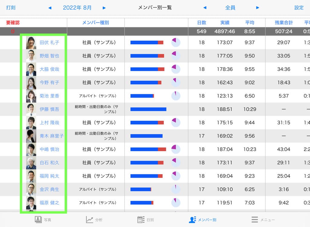 2.メンバー別画面で、打刻を修正したいメンバー名をタッチします。