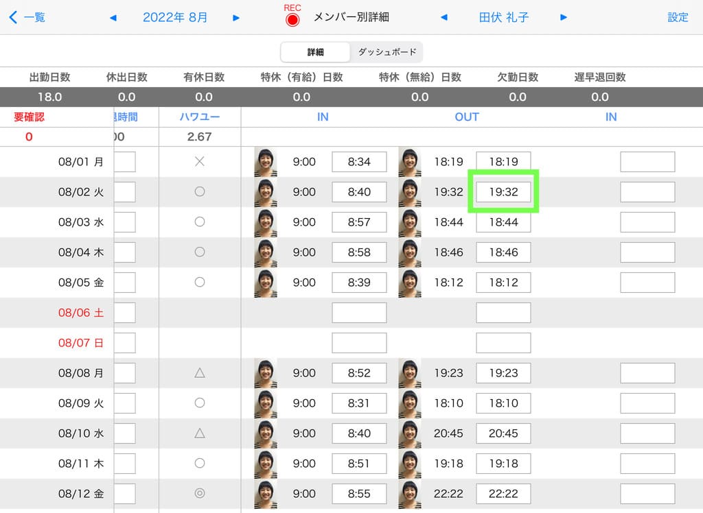 - 緑枠:打刻データの記録がないところに、新たに追加した場合