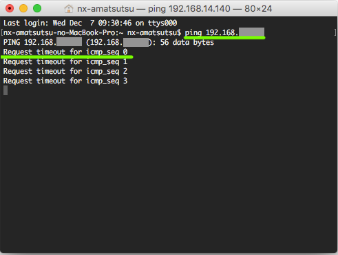 失敗したときは、「Request timeout for icmp_seq …」といった結果が表示されます。