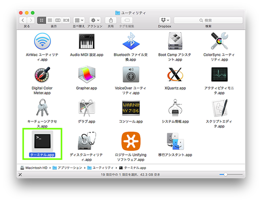 「アプリケーション」の「ユーティリティ」内の「ターミナル」を開きます。
