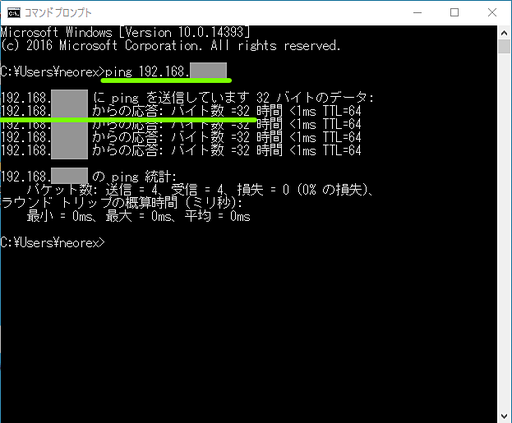 成功したときは「192…からの応答: バイト数 =32」のように表示されます。