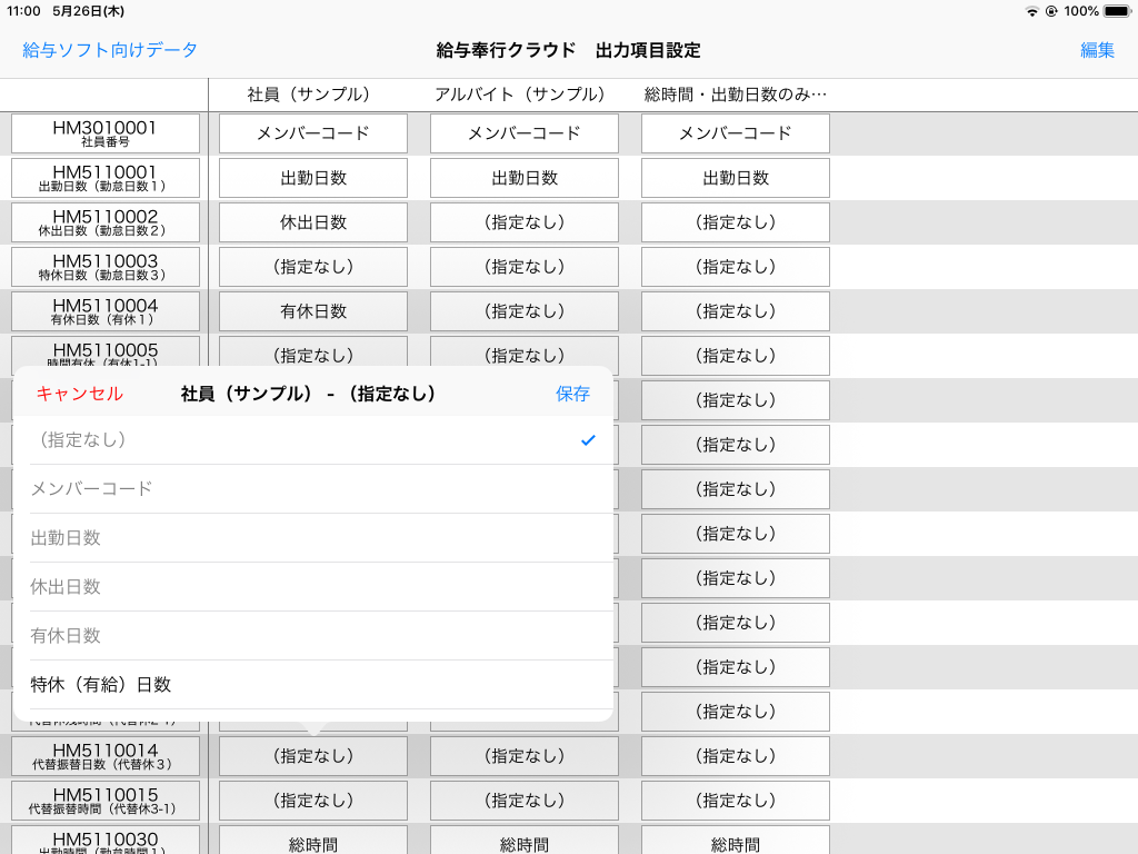 出力項目設定では、タブレット タイムレコーダーでの項目を、給与奉行クラウドの項目にどう対応させるか、紐づけを行います。