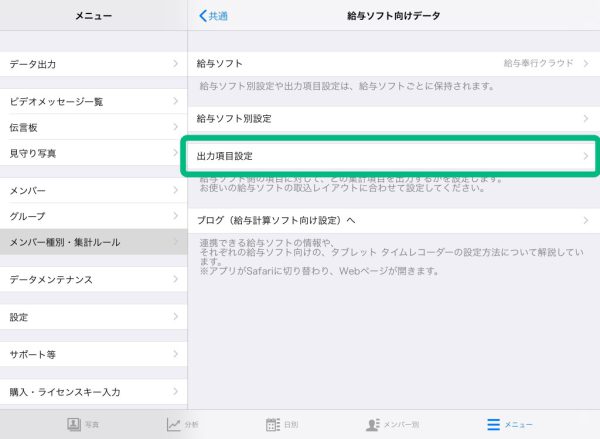 タブレット タイムレコーダーから給与奉行クラウド向けのデータを出力するためには、タブレット タイムレコーダーで「給与ソフトの選択」、「給与ソフト別設定」、「出力項目設定」を行う必要があります。