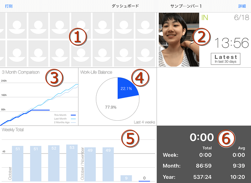 詳細画面から元の画面に戻るには、画面左上の「打刻」にタッチします。