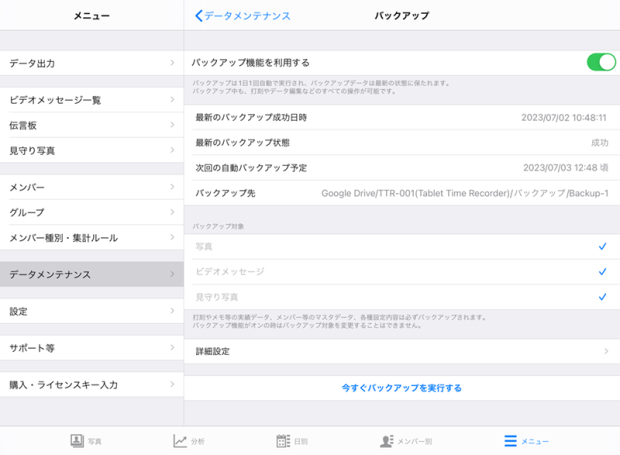 管理メニュー > データメンテナンス > バックアップ から、ソフトの全データをバックアップしてみましょう。